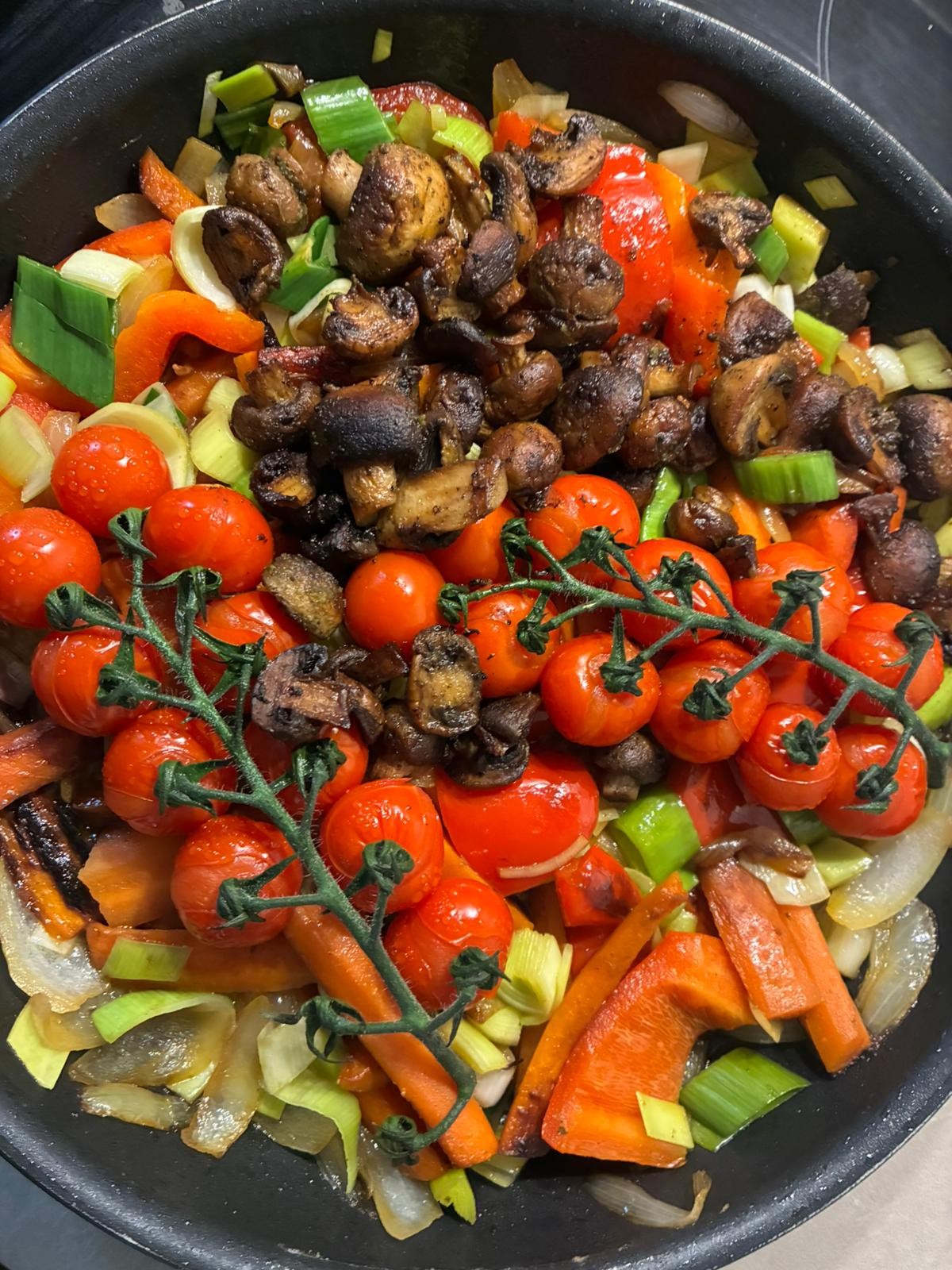 Zum Abschluss mit Salz und Pfeffer würzen, die Kräuter hinzugeben und vermengen sowie die Rispe Kirschtomaten auf das Gemüse legen. Für weitere 5 Minuten garen, bis die Tomaten weich sind.